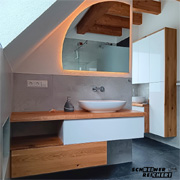 Waschtisch, Spiegelschrank und Nischenschrank an Dachschräge angepasst.
