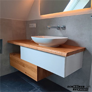Badmöbel und frei tragende Tablare in Eiche astig Massivholz.