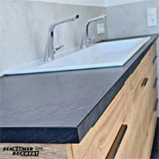 Waschtisch mit Beton Dekor auf Multiplexträger und weissen Fronten.