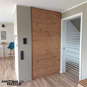 Vorsatzwand belegt mit geöltem Eiche Parkett.
