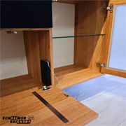 Offene Ablage für Receiver und Konsolen mit versteckter Kabeldurchführung zum Fernseher.