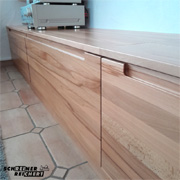 Fronten in Weisslack und Buche, mit eingefrästen Ziernuten.